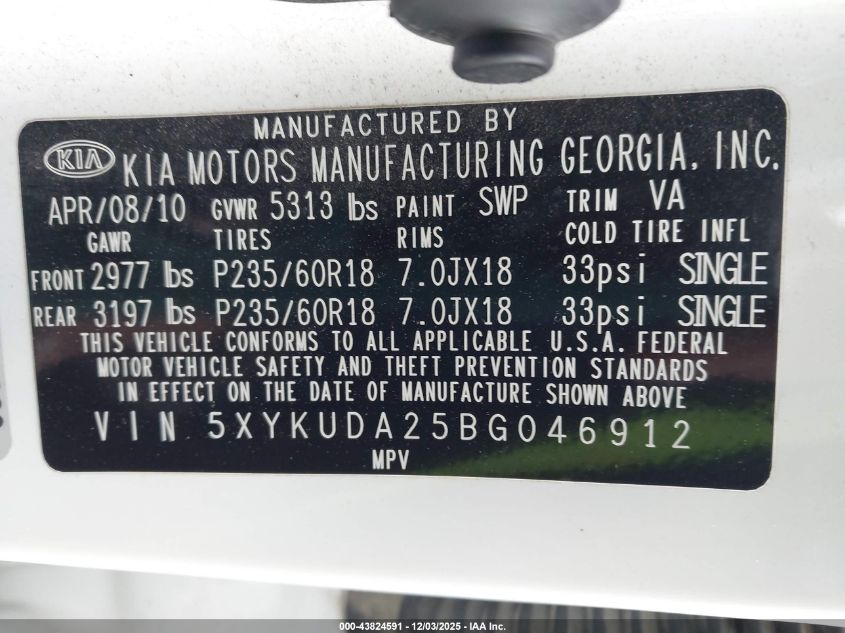 2011 KIA SORENTO 2011 року Бензин, 3.5, Полный привод, vin - 5XYKUDA25BG046912 из США