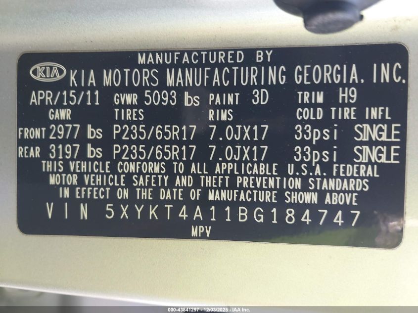2011 KIA SORENTO 2011 року Бензин, 2.4, Передний привод, vin - 5XYKT4A11BG184747 из США