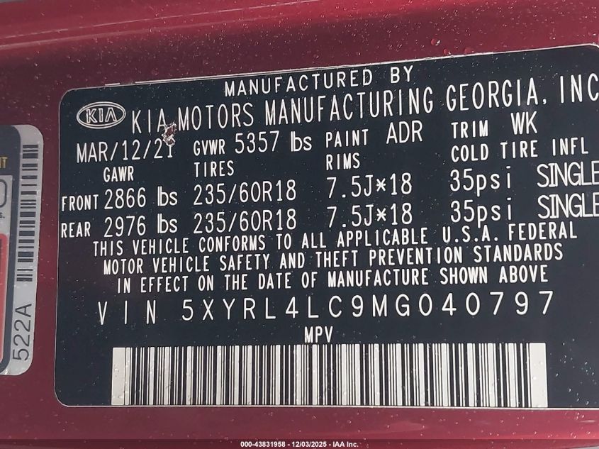 2021 KIA SORENTO 2021 року Бензин, 2.5, Передний привод, vin - 5XYRL4LC9MG040797 из США