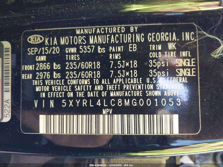 2021 KIA SORENTO 2021 року Бензин, 2.5, Передний привод, vin - 5XYRL4LC8MG001053 из США