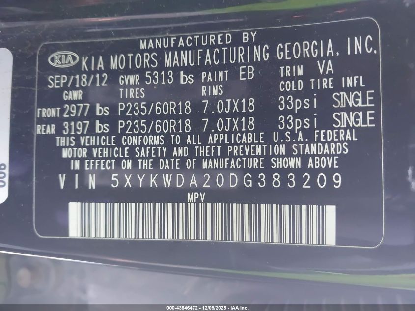 2013 KIA SORENTO 2013 року Бензин, 3.5, Полный привод, vin - 5XYKWDA20DG383209 из США