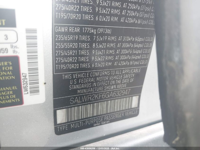 Цвет СеребряныйЦилиндры 6Привод Полный приводVIN SALWR2KF6GA632947Состояние СтационарноПовреждения Передняя или задняяДата аукциона 2025-12-10 AutoRIA
