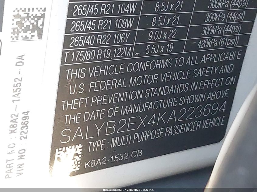 2019 LAND ROVER RANGE ROVER VELAR 2019 року Бензин, 2.0, Полный привод, vin - SALYB2EX4KA223694 из США