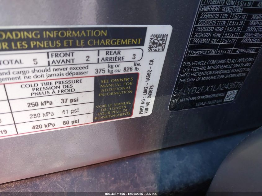 2020 LAND ROVER RANGE ROVER VELAR 2020 року Бензин, 2.0, Полный привод, vin - SALYB2EX1LA243578 из США