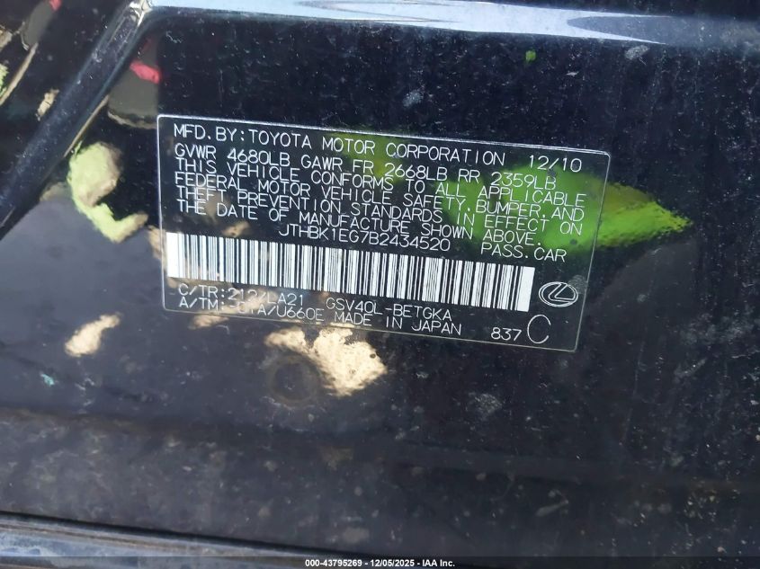 2011 LEXUS ES 350 2011 року Бензин, 3.5, Передний привод, vin - JTHBK1EG7B2434520 из США