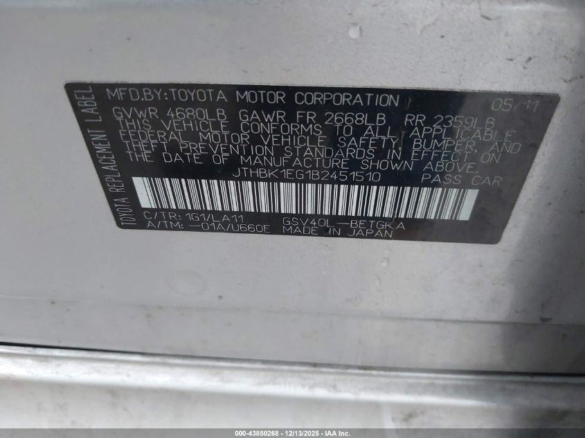 2011 LEXUS ES 350 2011 року Бензин, 3.5, Передний привод, vin - JTHBK1EG1B2451510 из США