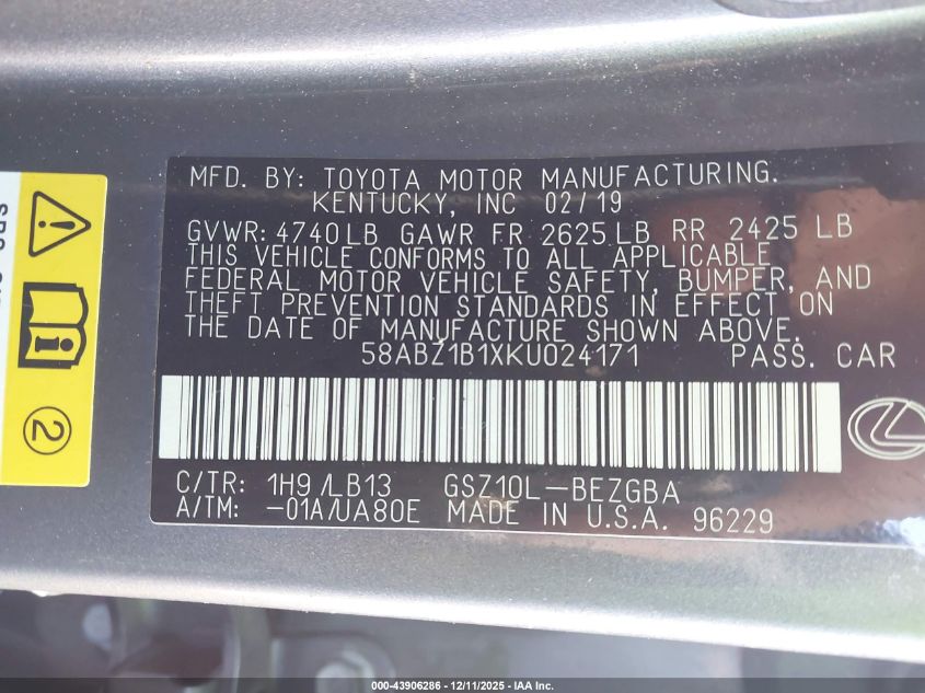 2019 LEXUS ES 350 2019 року Бензин, 3.5, Передний привод, vin - 58ABZ1B1XKU024171 из США