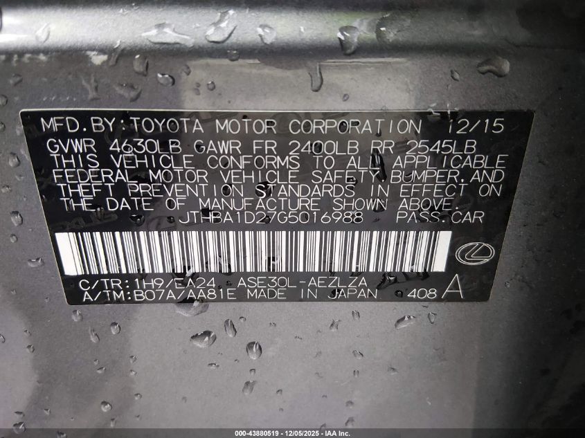 2016 LEXUS IS 200T 2016 року Бензин, 2.0, Задний привод, vin - JTHBA1D27G5016988 из США