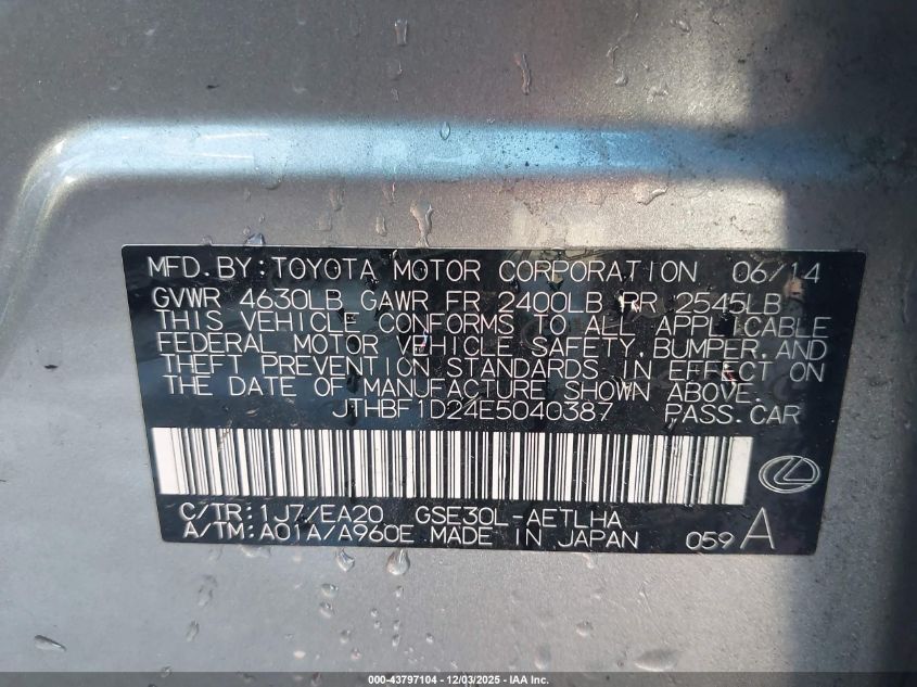 2014 LEXUS IS 250 2014 року Бензин, 2.5, Задний привод, vin - JTHBF1D24E5040387 из США