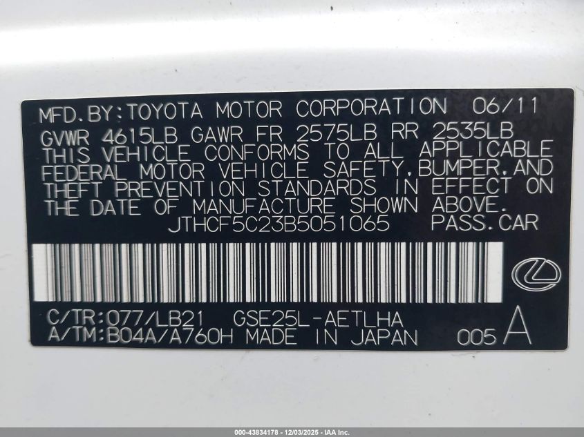 2011 LEXUS IS 250 2011 року Бензин, 2.5, Полный привод, vin - JTHCF5C23B5051065 из США