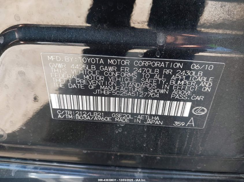 2010 LEXUS IS 250 2010 року Бензин, 2.5, Задний привод, vin - JTHBF5C25A5127704 из США