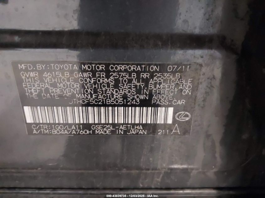 2011 LEXUS IS 250 2011 року Бензин, 2.5, Полный привод, vin - JTHCF5C21B5051243 из США