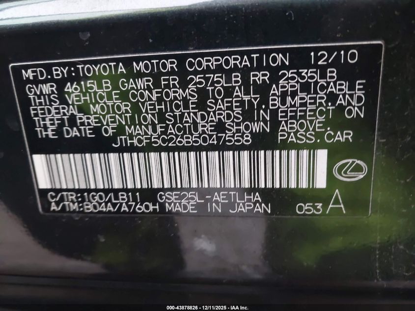 2011 LEXUS IS 250 2011 року Бензин, 2.5, Полный привод, vin - JTHCF5C26B5047558 из США
