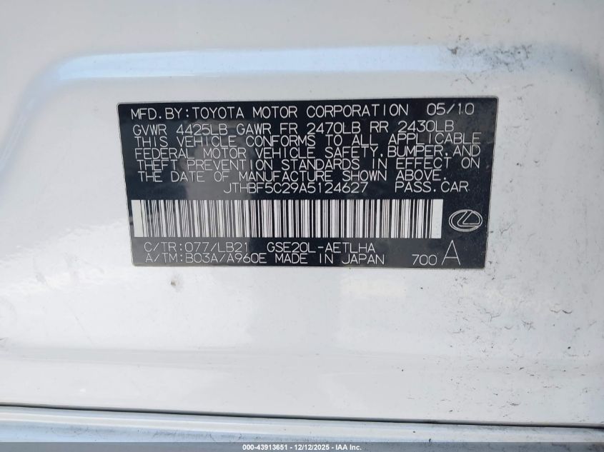 2010 LEXUS IS 250 2010 року Бензин, 2.5, Задний привод, vin - JTHBF5C29A5124627 из США