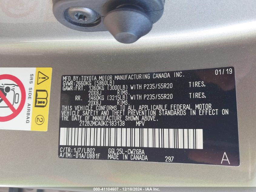 Цвет СеребряныйЦилиндры 6Привод Полный приводVIN 2T2BZMCA0KC183138Состояние СтационарноПовреждения Передняя или задняя AutoRIA