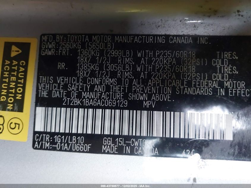 Цвет СеребряныйЦилиндры 6Привод Полный приводVIN 2T2BK1BA6AC069129Состояние СтационарноПовреждения Левая сторона AutoRIA