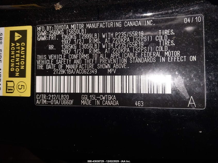 Цвет ЧерныйЦилиндры 6Привод Полный приводVIN 2T2BK1BA7AC062349Состояние СтационарноПовреждения Передняя правая AutoRIA