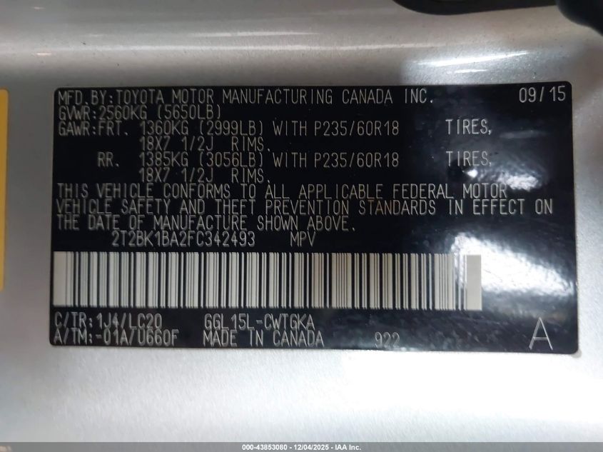 Цвет СеребряныйЦилиндры 6Привод Полный приводVIN 2T2BK1BA2FC342493Состояние СтационарноПовреждения Передняя или задняя AutoRIA