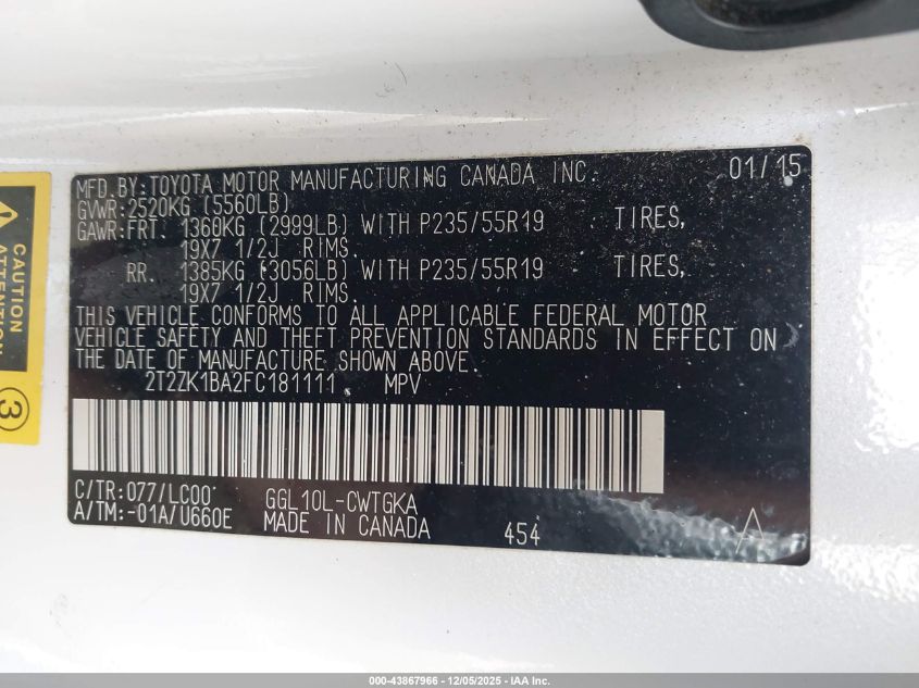Цвет БелыйЦилиндры 6Привод Передний приводVIN 2T2ZK1BA2FC181111Состояние Заводится и едет (проверено)Повреждения Передняя правая AutoRIA