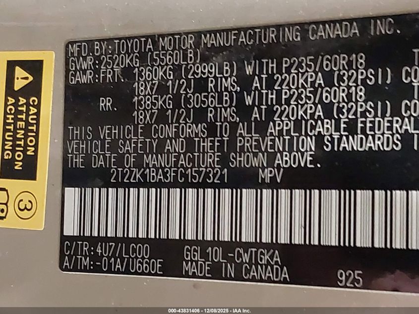 Цвет БежевыйЦилиндры 6Привод Передний приводVIN 2T2ZK1BA3FC157321Состояние Заводится и едет (проверено)Повреждения Передняя или задняя AutoRIA