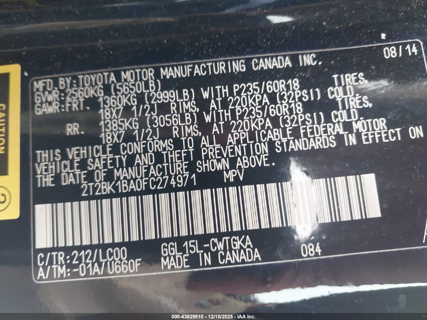 Цвет ЧерныйЦилиндры 6Привод Полный приводVIN 2T2BK1BA0FC274971Состояние СтационарноПовреждения Передняя или задняя AutoRIA