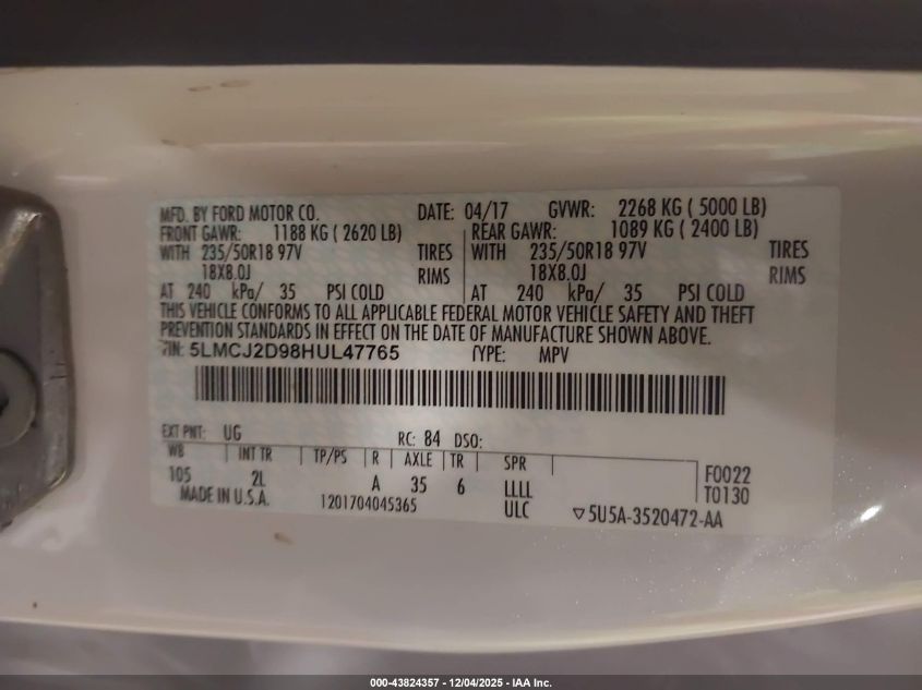 Цвет БелыйЦилиндры 4Привод Полный приводVIN 5LMCJ2D98HUL47765Состояние Заводится и едет (проверено)Повреждения Задняя AutoRIA
