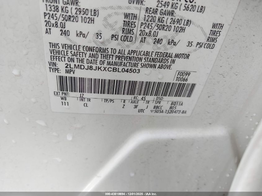 Цвет БелыйЦилиндры 6Привод Полный приводVIN 2LMDJ8JKXCBL04503Состояние Заводится и едет (проверено)Повреждения Передняя или задняя AutoRIA