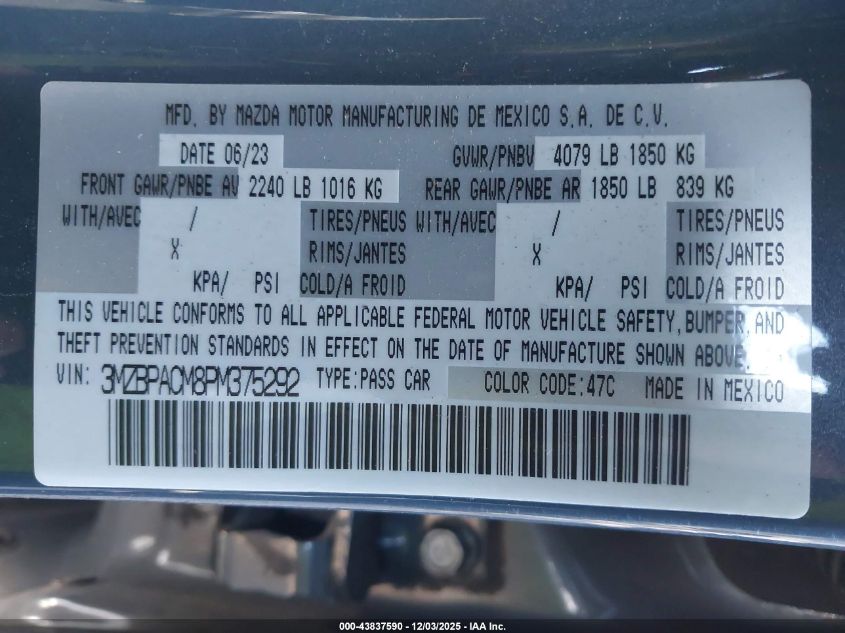 2023 MAZDA 3 2023 року Бензин, 2.5, Передний привод, vin - 3MZBPACM8PM375292 из США
