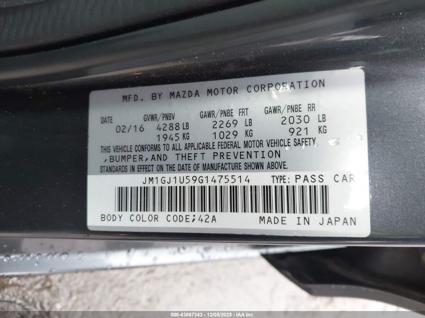 2016 MAZDA 6 2016 року Бензин, 2.5, Передний привод, vin - JM1GJ1U59G1475514 из США