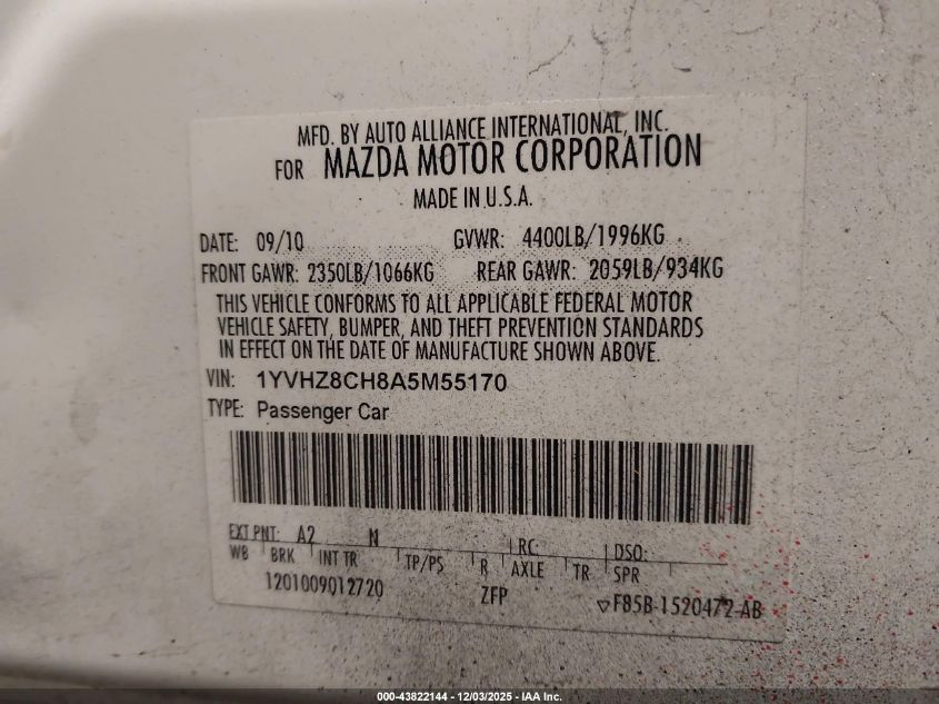 2010 MAZDA 6 2010 року Бензин, 2.5, Передний привод, vin - 1YVHZ8CH8A5M55170 из США