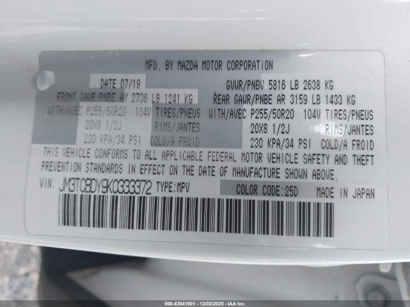 2019 MAZDA CX-9 2019 року Бензин, 2.5, Полный привод, vin - JM3TCBDY9K0333372 из США
