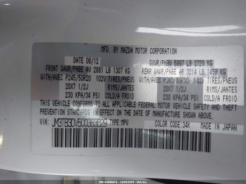 Цвет БелыйЦилиндры 6Привод Полный приводVIN JM3TB3DV5C0363629Состояние СтационарноПовреждения По бокам AutoRIA
