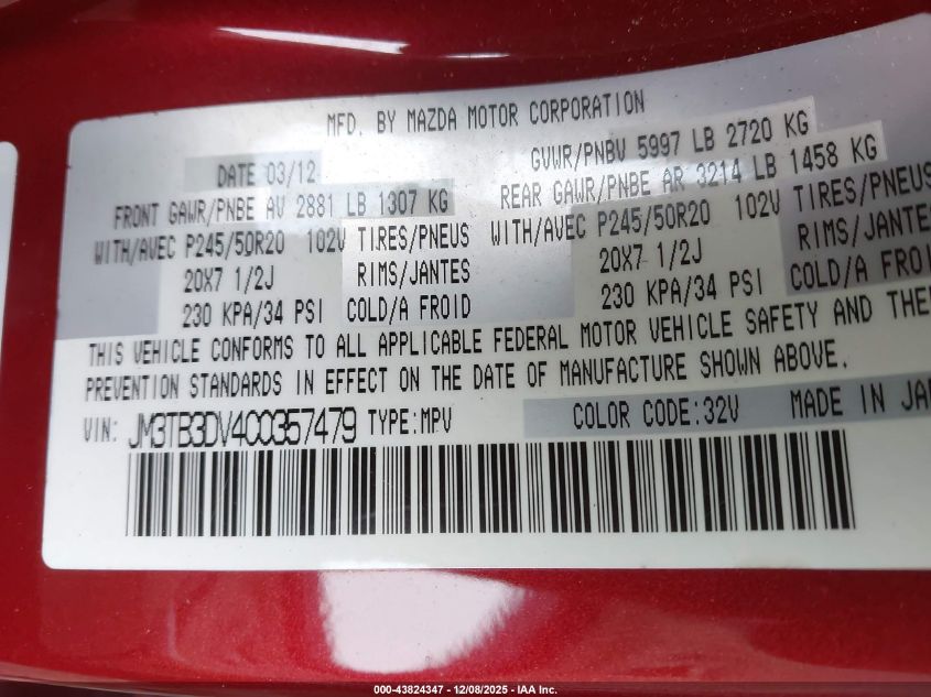 Цвет БургундияЦилиндры 6Привод Полный приводVIN JM3TB3DV4C0357479Состояние Заводится и едет (проверено)Повреждения Передняя или задняя AutoRIA