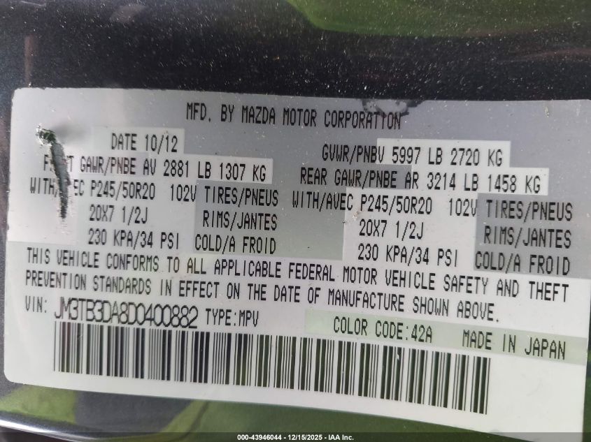 2013 MAZDA CX-9 2013 року Бензин, 3.7, Полный привод, vin - JM3TB3DA8D0400882 из США