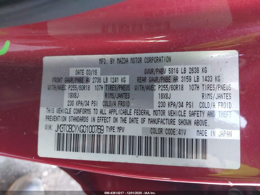 2016 MAZDA CX-9 2016 року Бензин, 2.5, Полный привод, vin - JM3TCBCYXG0100769 из США