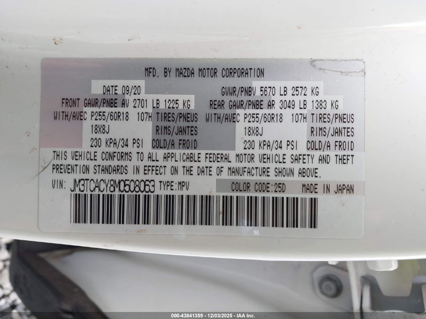 2021 MAZDA CX-9 2021 року Бензин, 2.5, Передний привод, vin - JM3TCACY8M0508063 из США