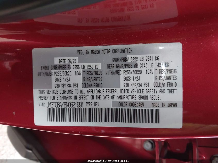 2022 MAZDA CX-9 2022 року Бензин, 2.5, Полный привод, vin - JM3TCBAY8N0621991 из США