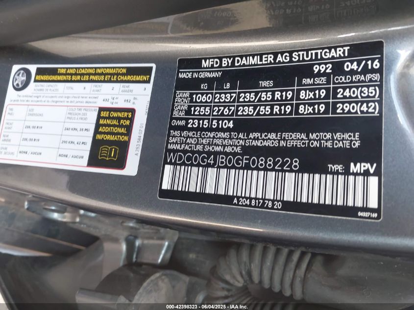 Цвет СерыйЦилиндры 4VIN WDC0G4JB0GF088228Состояние СтационарноПовреждения Передняя или задняяДата аукциона 2025-12-09 AutoRIA