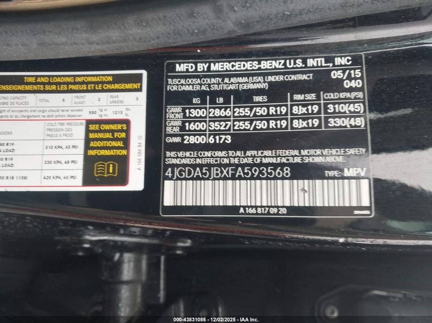 2015 MERCEDES-BENZ M-CLASS 2015 року Бензин, 3.5, , vin - 4JGDA5JBXFA593568 из США