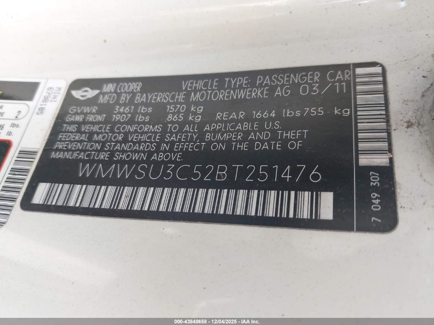 2011 MINI COOPER 2011 року Бензин, 1.6, Передний привод, vin - WMWSU3C52BT251476 из США