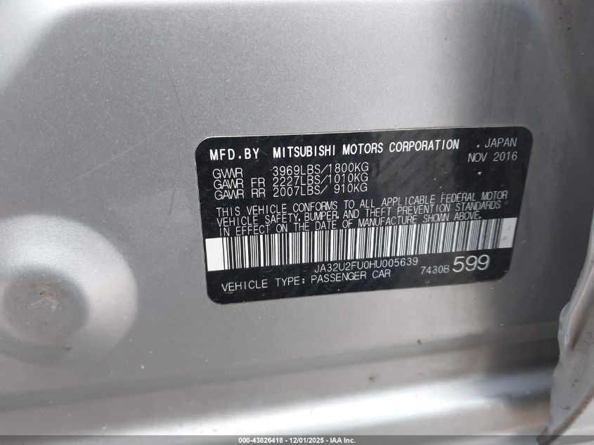 2017 MITSUBISHI LANCER 2017 року Бензин, 2.0, Передний привод, vin - JA32U2FU0HU005639 из США