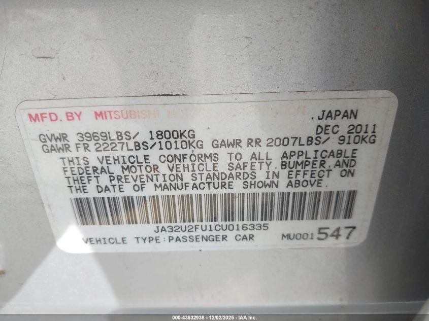 2012 MITSUBISHI LANCER 2012 року Бензин, 2.0, Передний привод, vin - JA32U2FU1CU016335 из США