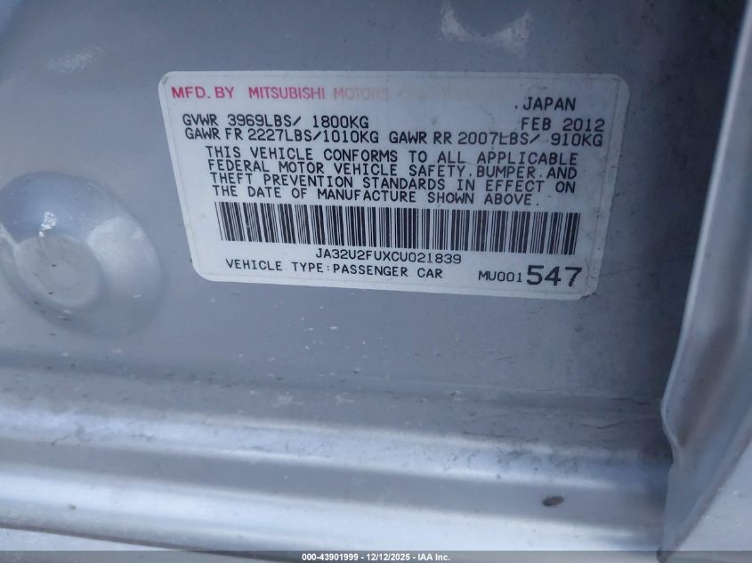 2012 MITSUBISHI LANCER 2012 року Бензин, 2.0, Передний привод, vin - JA32U2FUXCU021839 из США