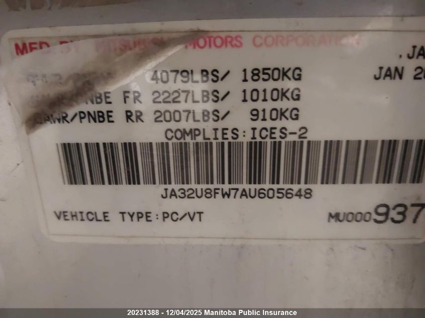 Цвет СеребряныйЦилиндры 4Привод Передний приводVIN JA32U8FW7AU605648Состояние СтационарноПовреждения Левая сторонаДата аукциона 2025-12-10 AutoRIA