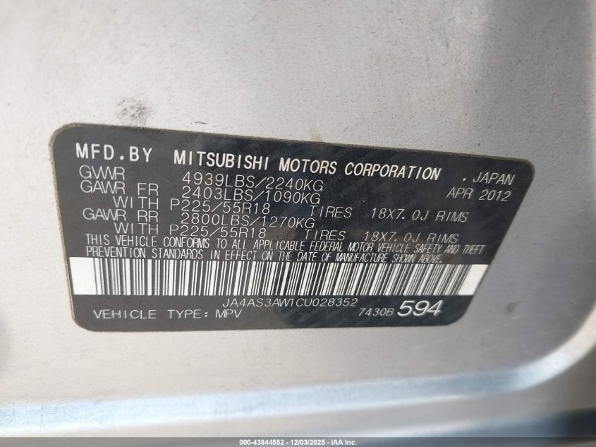 2012 MITSUBISHI OUTLANDER 2012 року Бензин, 2.4, Передний привод, vin - JA4AS3AW1CU028352 из США