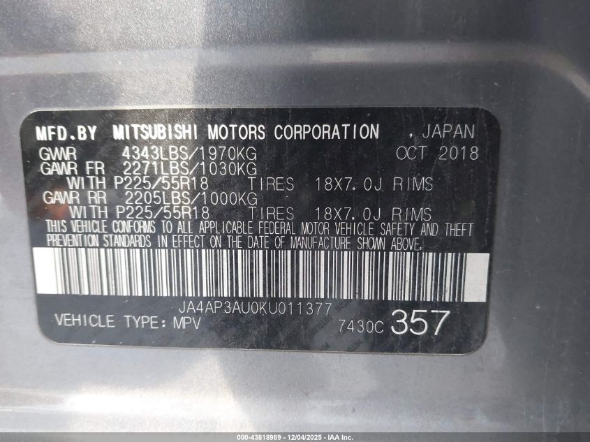2019 MITSUBISHI OUTLANDER SPORT 2019 року Бензин, 2.0, Передний привод, vin - JA4AP3AU0KU011377 из США