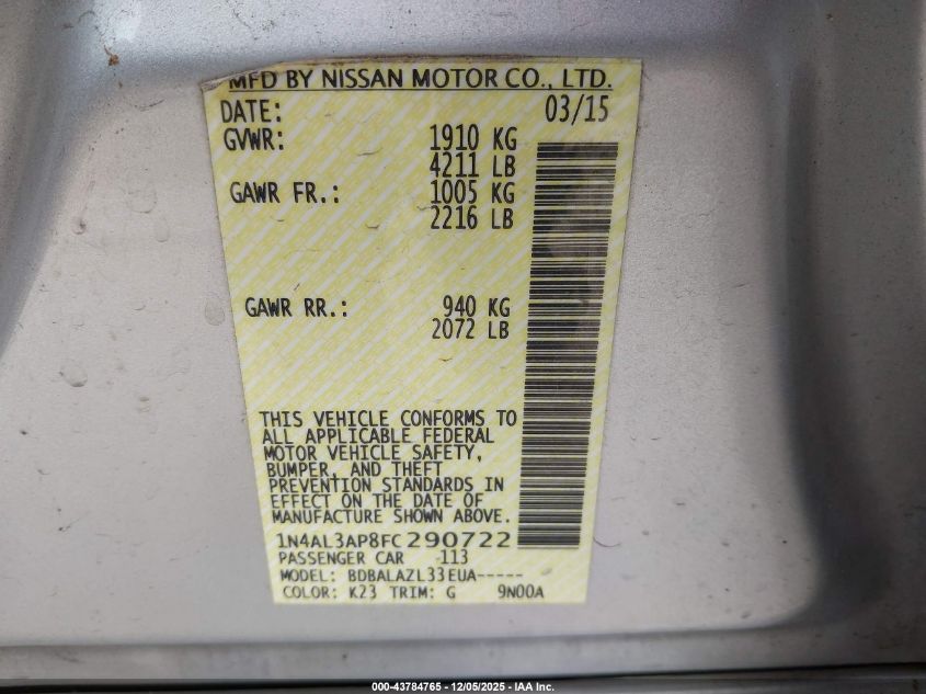 2015 NISSAN ALTIMA 2015 року Бензин, 2.5, Передний привод, vin - 1N4AL3AP8FC290722 из США