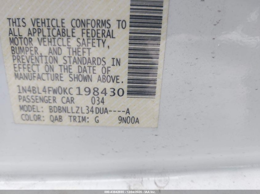 2019 NISSAN ALTIMA 2019 року Бензин, 2.5, Полный привод, vin - 1N4BL4FW0KC198430 из США