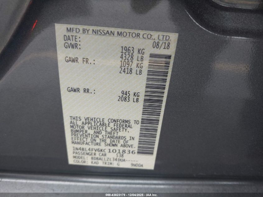 2019 NISSAN ALTIMA 2019 року Бензин, 2.5, Передний привод, vin - 1N4BL4FV6KC101836 из США
