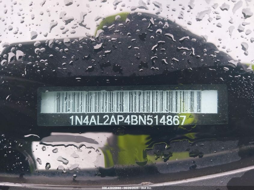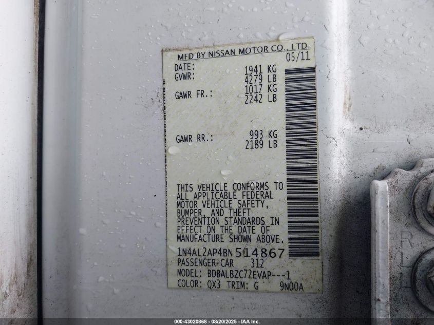 Цвет БелыйЦилиндры 4Привод Передний приводVIN 1N4AL2AP4BN514867Состояние СтационарноПовреждения По бокамДата аукциона 2025-12-09 AutoRIA